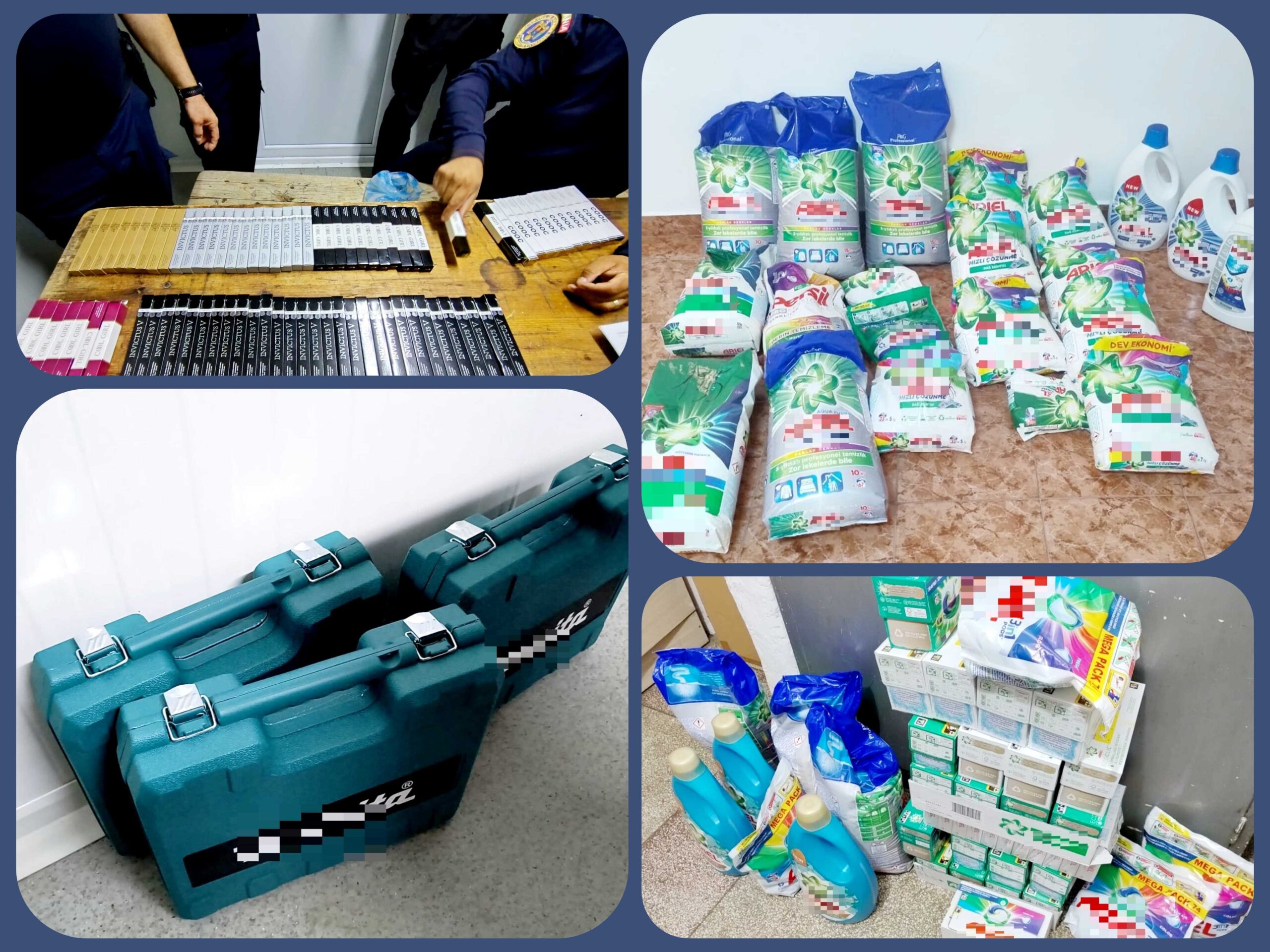 În urma verificărilor efectuate asupra a șase bărbați și o femeie, cu vârsta între 25 și 50 de ani, au fost găsite mai multe unelte electrice de uz gospodăresc, detergenți și parfumuri cu numele unor mărci de renume.