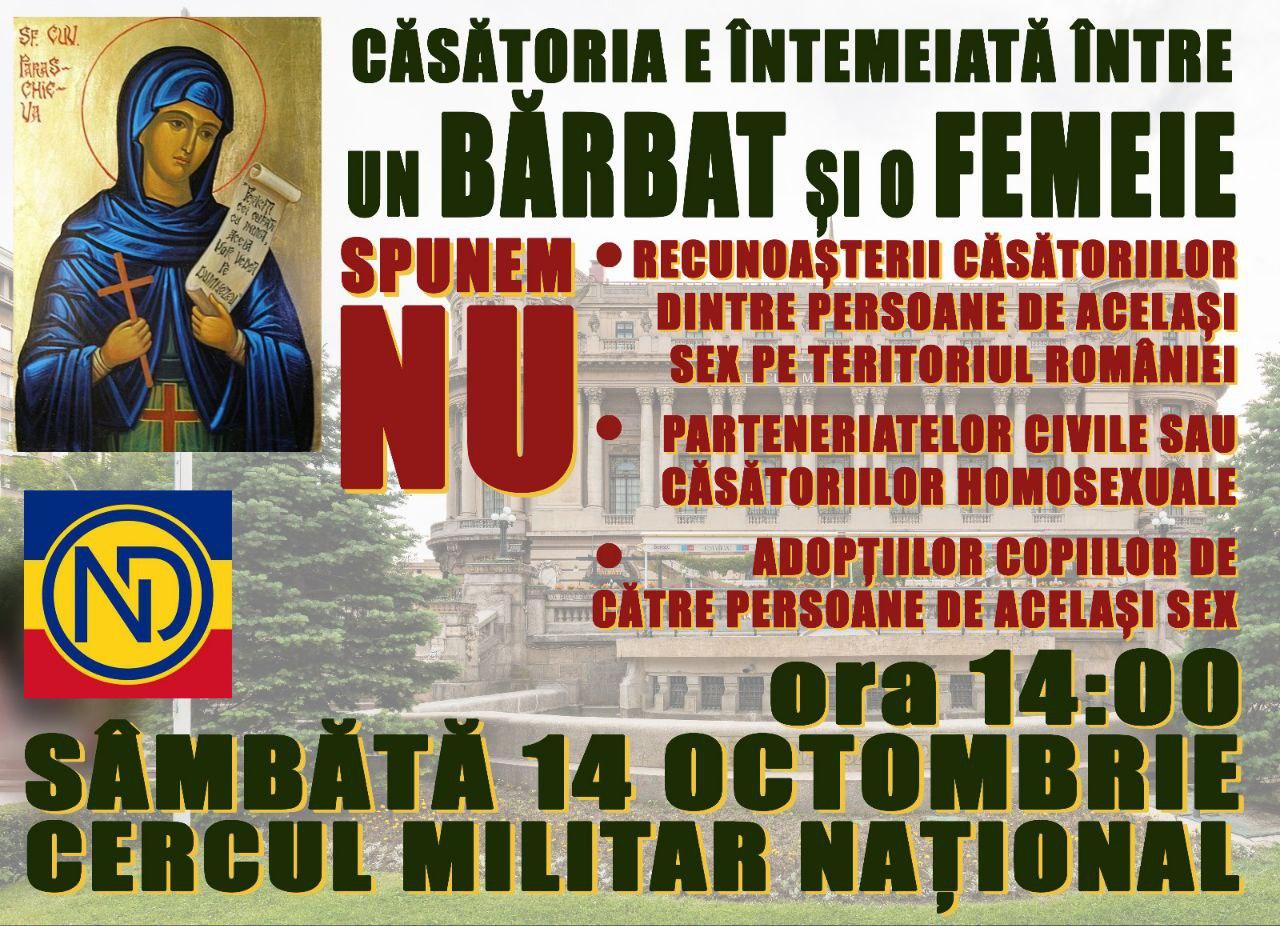 Pentru viitorul familiei și a neamului nostru, pentru siguranța copiilor noștri, pentru credința noastră strămoșească, vino sâmbătă 14 octombrie în fața Cercului Militar Național începând cu ora 14:00 pentru a spune un NU hotărât demersurilor pentru legalizarea parteneriatelor și căsătoriilor homosexuale și un NU la fel de hotărât adopțiilor de copii de către „cuplurile” homosexuale!