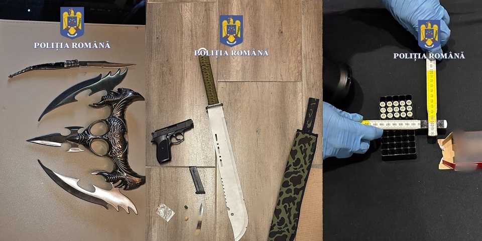 Totodată, la data de 27 august a.c., în baza unui mandat, au fost efectuate trei percheziții domiciliare în municipiul Sibiu, fiind identificate și ridicate la domiciliul bărbatului de 28 de ani următoarele: mai multe pliculețe ce conțineau un praf de culoare albă, un plic ce conținea substanță solidă de forma unor pietricele de culoare alb transparent, 23 de cartușe de 0,9 mm, destinate unei arme cu gaz, mai multe arme albe și două cântare electronice de precizie.