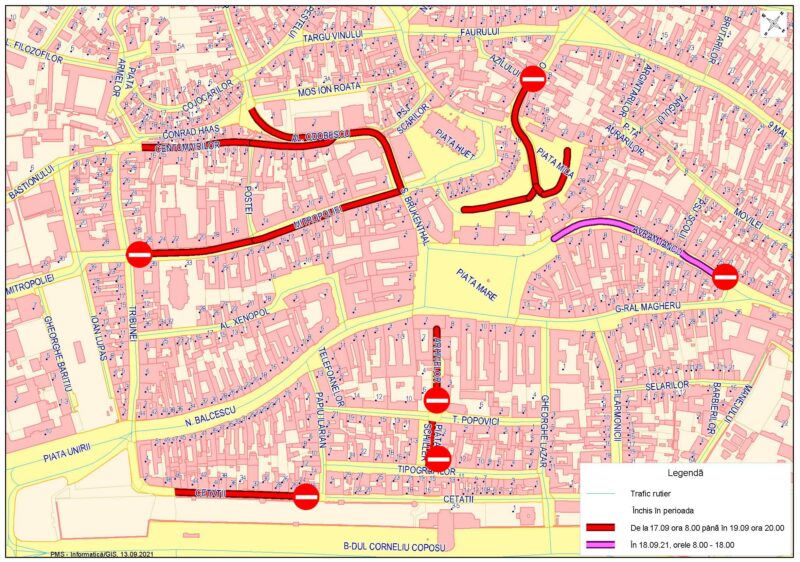 Și strada Avram Iancu va fi închisă traficului între Piața Mare și intersecția cu str. General Magheru, dar doar sâmbătă, 18 septembrie, în intervalul orar 08.00 – 18.00.