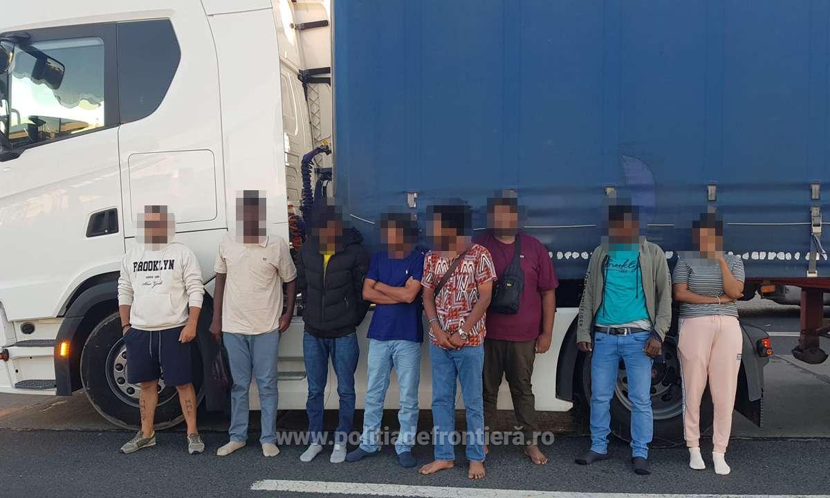 În urma efectuării controlului amănunţit al mijlocului de transport, au fost descoperiţi, ascunşi în spațiul destinat odihnei șoferului din cabina capului tractor, şapte cetăţeni străini.