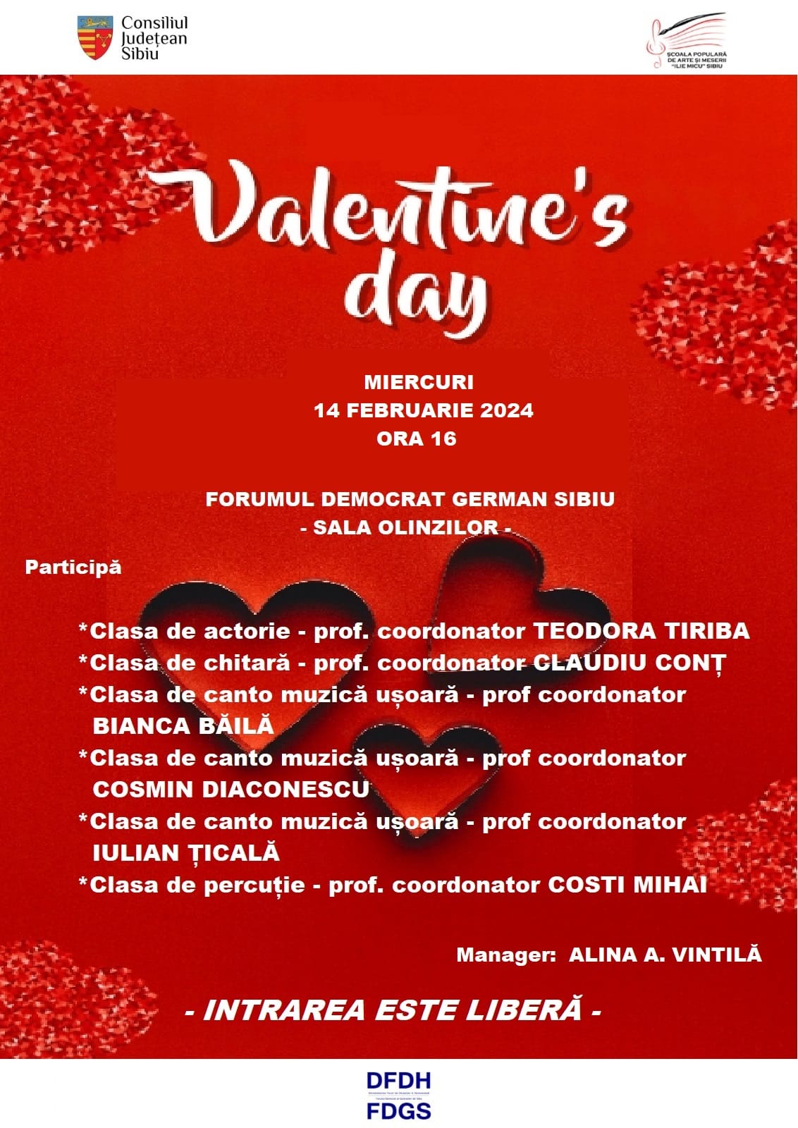Consiliul Județean Sibiu, prin Școala Populară de Arte și Meserii „Ilie Micu”, în parteneriat cu Forumul Democrat al Germanilor din România, invită toți sibienii să celebreze iubirea împreună cu elevi ai claselor de:
