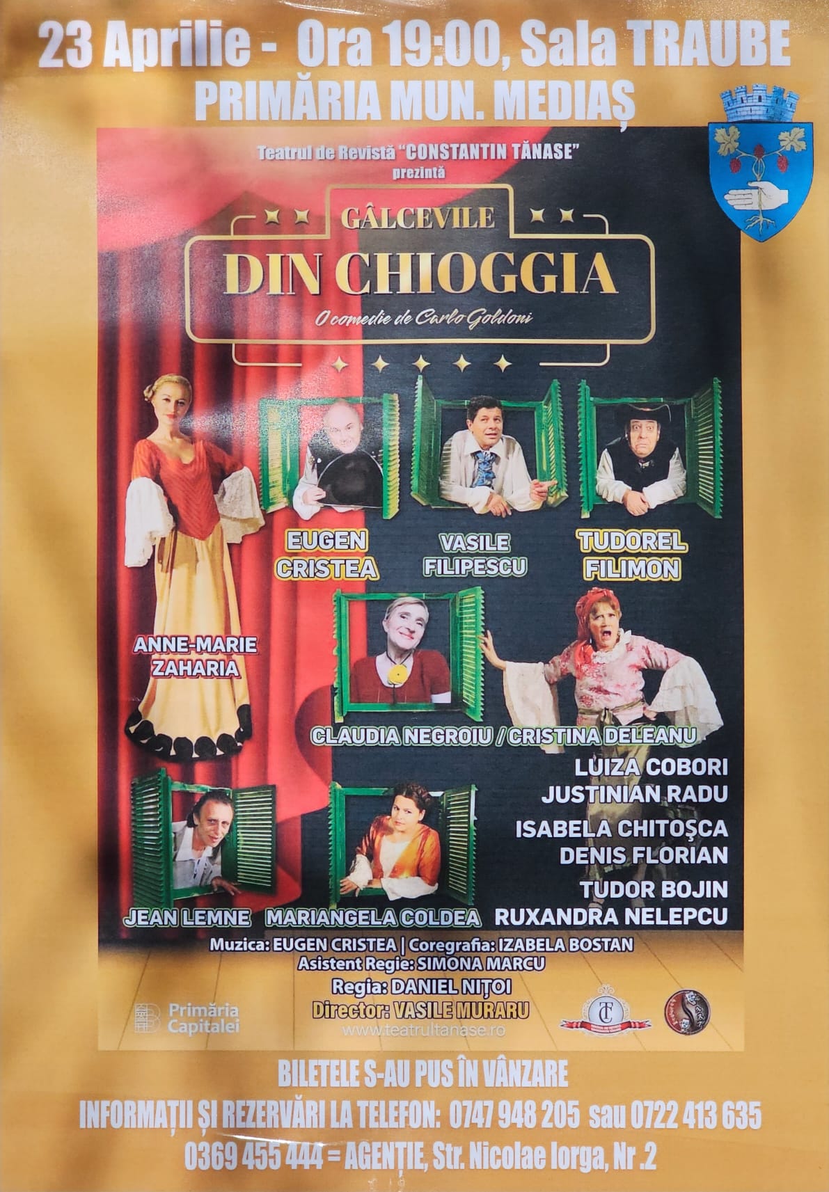 Sala Traube din municipiul Mediaș găzduiește marți, 23 aprilie 2024, un spectacol de teatru pus în scenă de către actorii Teatrului de Revistă „Constantin Tănase“ din București. Medieșenii sunt invitați să urmărească o comedie după Carlo Goldoni – „Gâlcevile din Chioggia“, avându-i ca protagoniști pe binecunoscuții Anne-Marie Zaharie, Eugen Cristea, Tudorel Filimon și Vasile Filipescu.