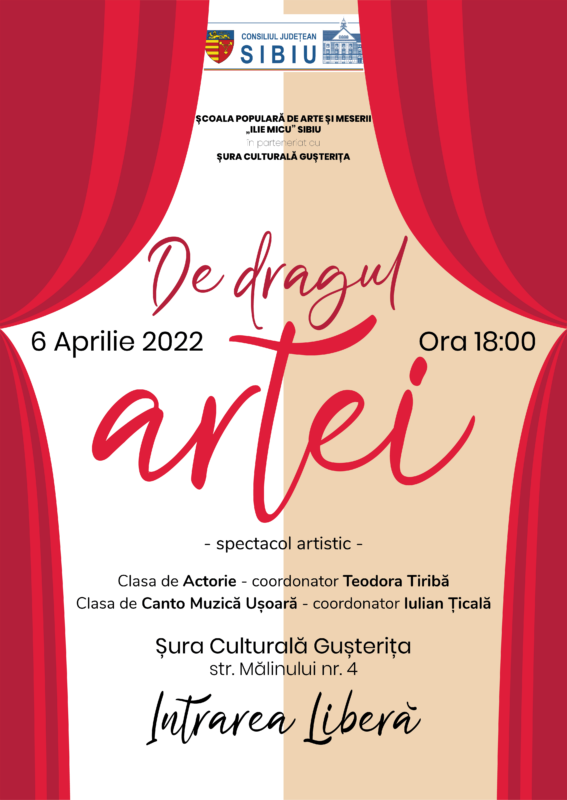 Consiliul Județean Sibiu, prin Școala Populară de Arte și Meserii „Ilie Micu” Sibiu, în parteneriat cu Șura Culturală Gușterița, organizează miercuri, 6 aprilie 2022, începând cu ora 18:00, spectacolul artistic: „De dragul artei”.