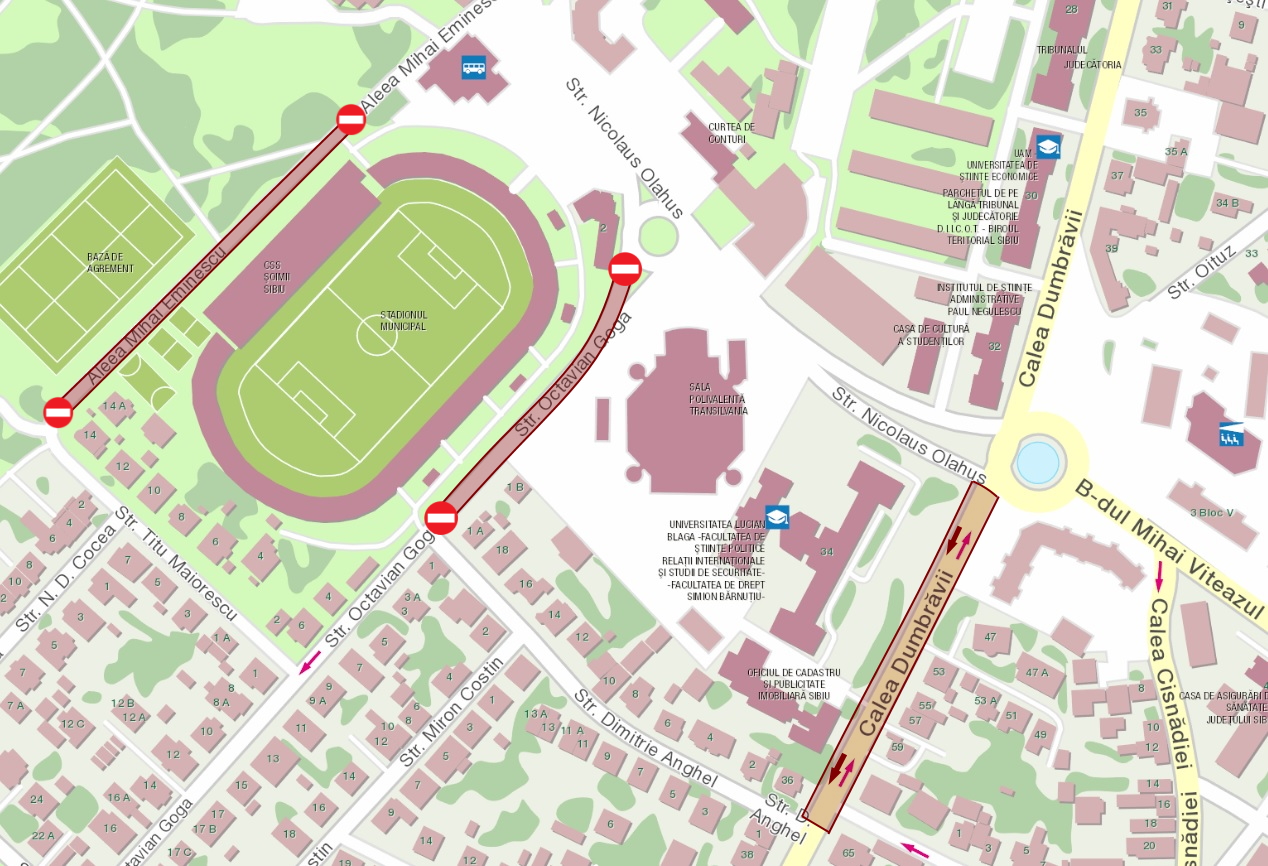 - Închiderea circulației auto pe Aleea Mihai Eminescu, între Hotel Parc și strada Titu Maiorescu, inclusiv parcarea din fața Stadionului.