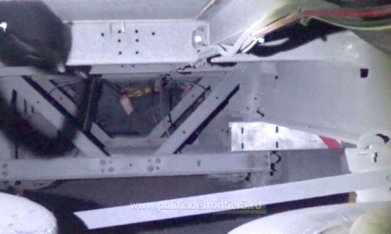 În urma controlului preliminar efectuat asupra mijlocului de transport, polițiștii de frontieră au constatat faptul că pe șasiu se află ascunsă o persoană de sex masculin.