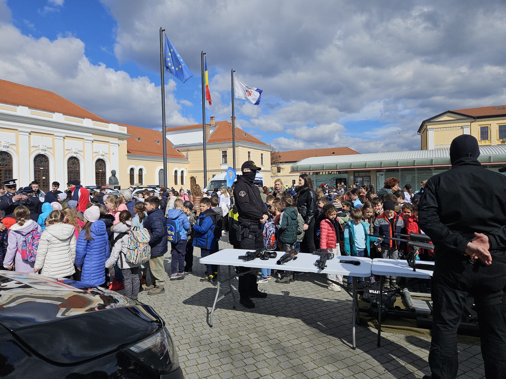 Polițiști de la rutieră, ordine publică, criminalistic, siguranță școlară, prevenire și cei ai Serviciului pentru Acțiuni Speciale au prezentat mijloacele de intervenție și dotările autospecialelor, au interacționat cu sute de vizitatori și au primit mesajele de „La mulți ani”, din partea acestora.