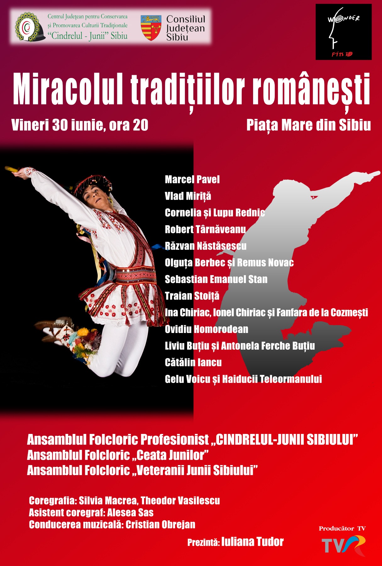 Junii Sibiului și Festivalul Internațional de Teatru de la Sibiu provoacă localnicii și turiștii la o seară sub semnul obiceiurilor, cântecelor și dansurilor populare românești. Se întâmplă vineri 30 iunie, ora 20, în Piața Mare din Sibiu, la premiera „Miracolul tradițiilor românești”.