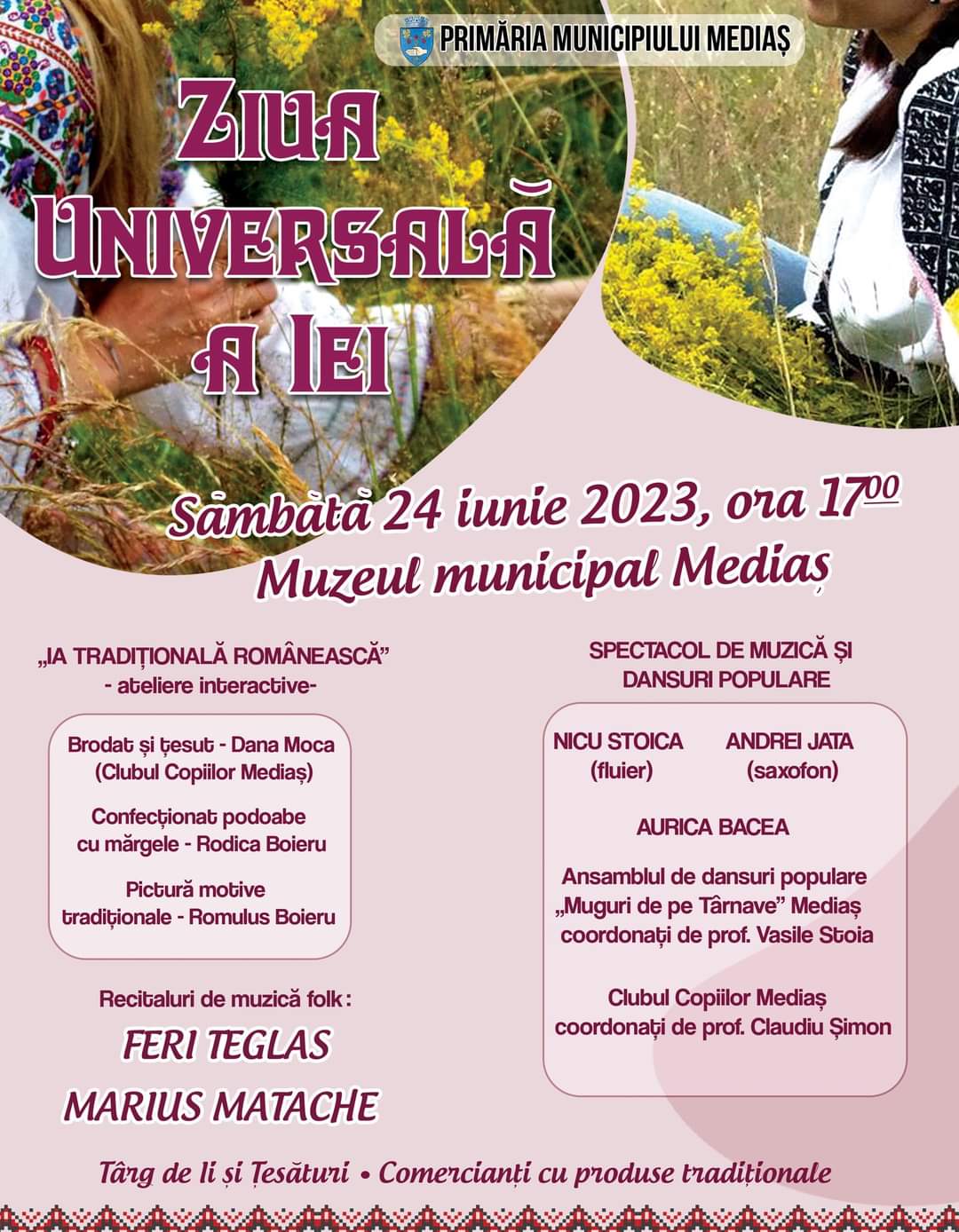 Cu această ocazie, Primăria Municipiului Mediaș, prin Directia pentru Cultură, organizează în data de 24 iunie 2023 „Ziua Universală a Iei”, o manifestare artistică cu multă voie bună, cântece și jocuri populare. Evenimentul va avea loc la Muzeul Municipal Mediaș, cu începere de la ora 17:00.